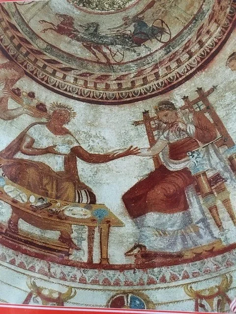 Something sad about this 9th century banquet. The Thracian queen looks downward, refusing the king’s offer of food. Does she regret the situation she finds herself in? As a favored wife she must go with her husband when he dies. To find out more, see my poem “A Favored Wife” in Dance of Atoms.