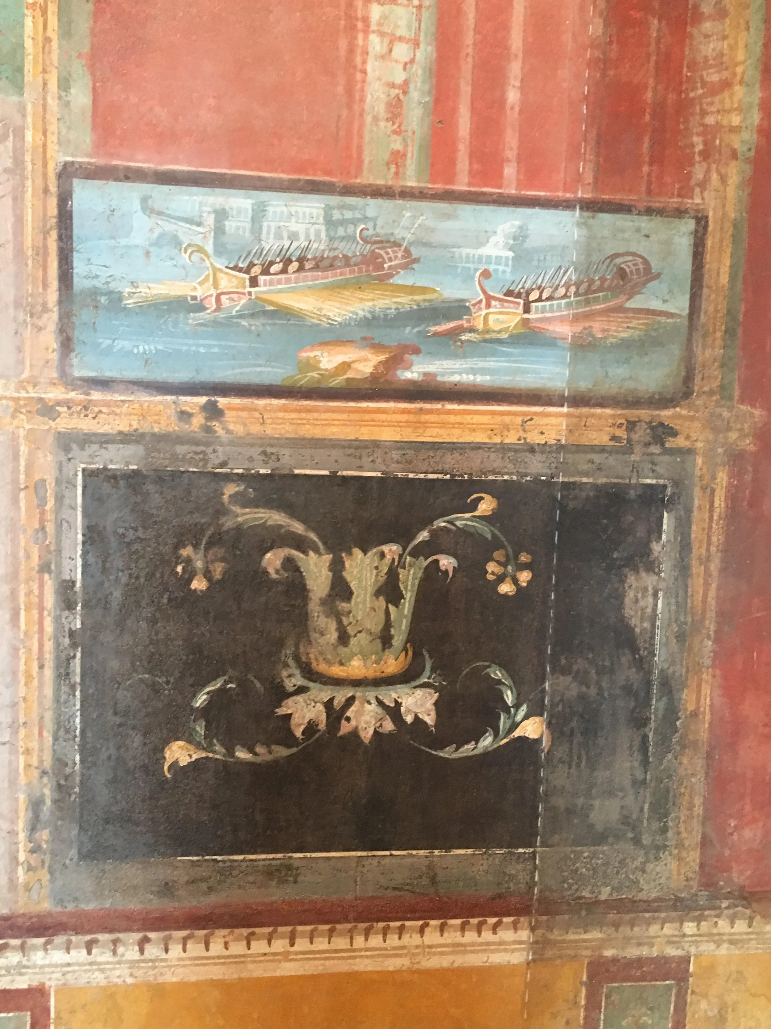 The table in the painting is in better shape than the surviving carbonized one in the museum case. Such tables, along with the glass objects on the floor in this museum display, were common at dinner time in Pompeii before 79 CE. See my poem “Las Supper in Pompeii” in the just-published poetry collection, DANCE OF ATOMS.